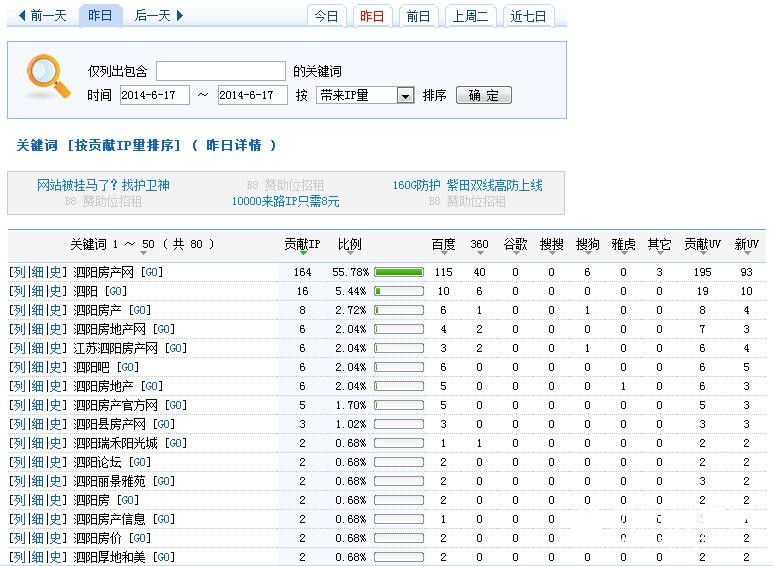 下图为2014年6月17日总访问量。当天共有749条宽带线路,3311台独立电脑访问了泗阳房产网10339次。平均每人点击13.8次独立页面。