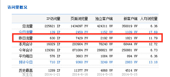 下图为2014年6月18日总访问量。当天共有630条宽带线路,2192台独立电脑访问了泗阳房产网7429次。平均每人点击11.79次独立页面。
