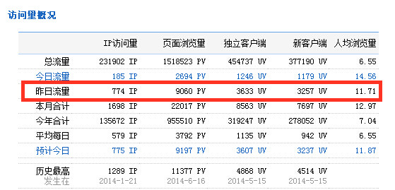 下图为2014年7月2日总访问量。当天共有774条宽带线路,3633台独立电脑访问了泗阳房产网9060次。平均每人点击11.71次独立页面。