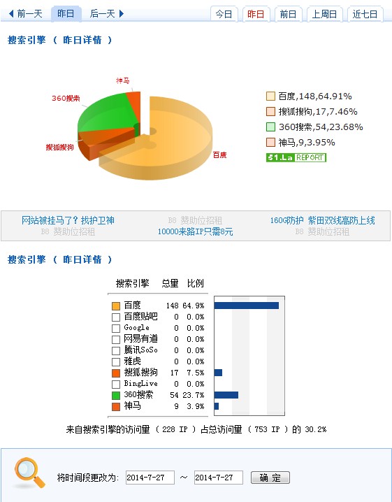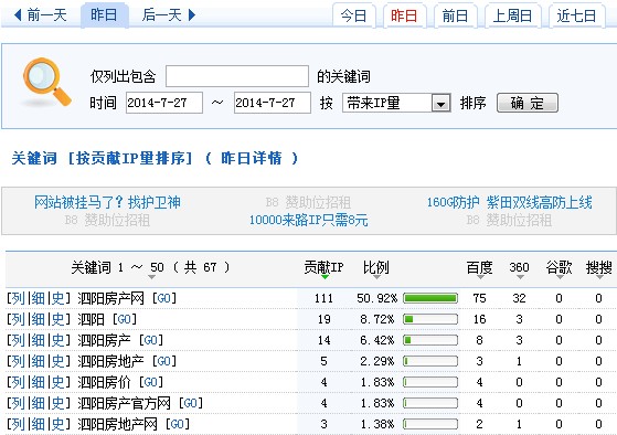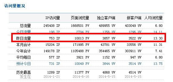 下图为2014年7月27日总访问量。当天共有753条宽带线路,3857台独立电脑访问了泗阳房产网10013次。平均每人点击13.3次独立页面。