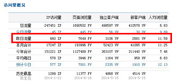 下图为2014年7月30日总访问量。当天共有660条宽带线路,3106台独立电脑访问了泗阳房产网7649次。平均每人点击11.59次独立页面。