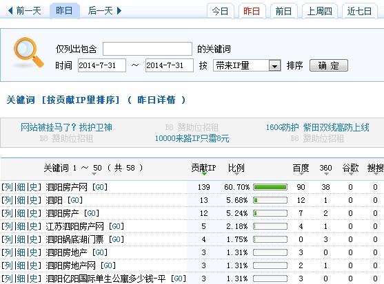 下图为2014年7月31日总访问量。当天共有742条宽带线路,2827台独立电脑访问了泗阳房产网7977次。平均每人点击10.75次独立页面。