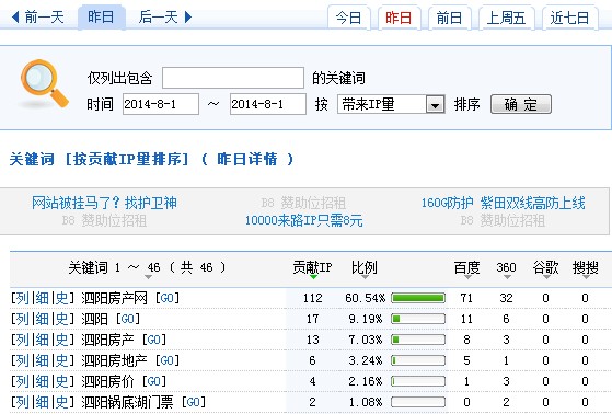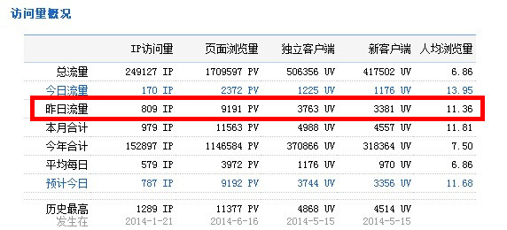 下图为2014年8月1日总访问量。当天共有809条宽带线路,3763台独立电脑访问了泗阳房产网9191次。平均每人点击11.36次独立页面。