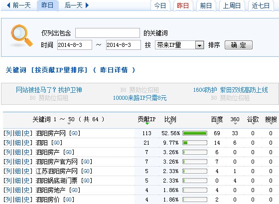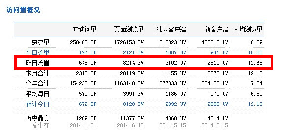 下图为2014年8月3日总访问量。当天共有648条宽带线路,3102台独立电脑访问了泗阳房产网8214次。平均每人点击12.68次独立页面。