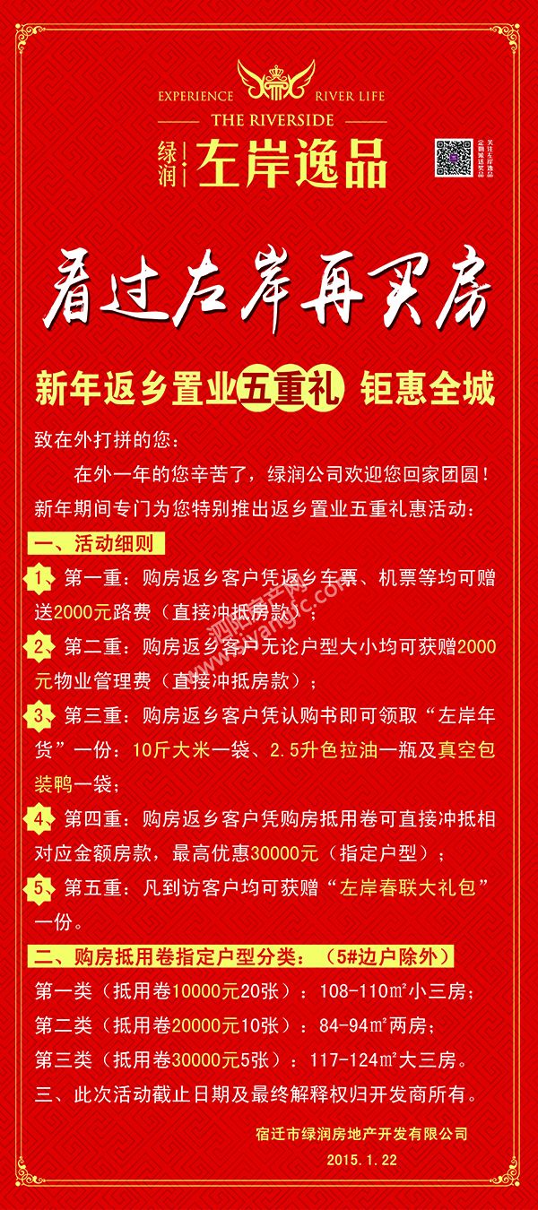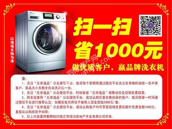 泗阳房产网小编了解: 关注“左岸逸品”公众微信平台,左岸逸品每个星期将通过微信平台关注名单随机抽取一名中奖客户,奖品为小天鹅全自动洗衣机一台;