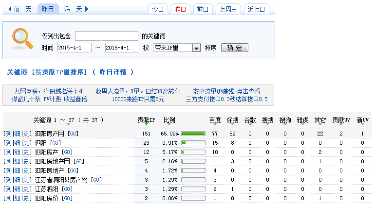 下图为2015年04月01日总访问量。当天共有822条宽带线路,903台独立电脑访问了泗阳房产网11670次。平均每人点击14.20独立页面。