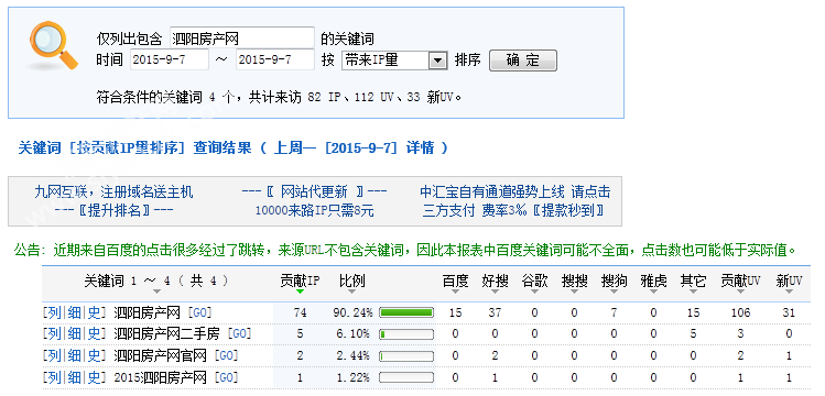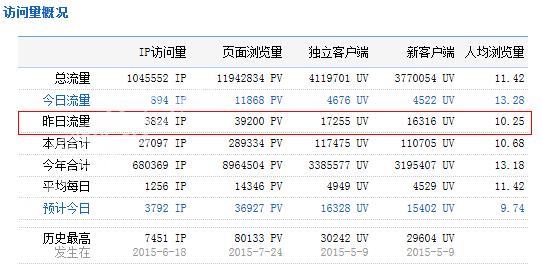 下图为2015年09月07日总访问量。当天共有3824宽带线路,17255台独立电脑访问了泗阳房产39200次。平均每人点击10.25立页面。