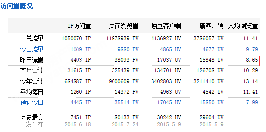 下图为2015年09月08日总访问量。当天共有4403宽带线路,17037台独立电脑访问了泗阳房产38093次。平均每人点击8.65立页面。