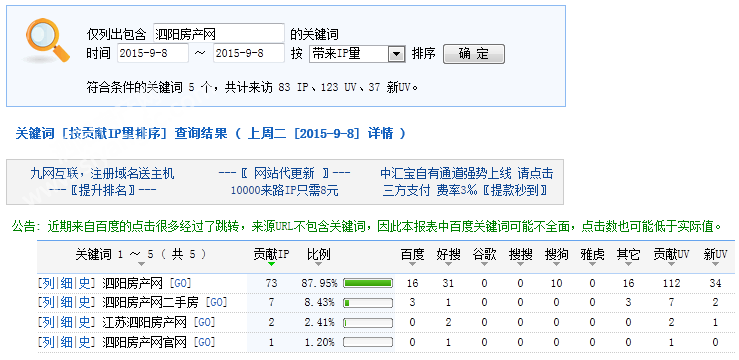下图为网友通过搜索引擎找到泗阳房产网图表325名网友通过百度搜索找到泗阳房产网;1482名网友通过360搜索找到泗阳房产网;68名网友通过搜狐搜狗搜索找到泗阳房产网。