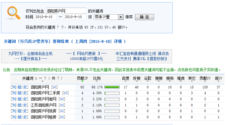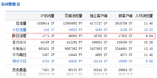 下图为2015年09月10日总访问量。当天共有4774宽带线路,18702台独立电脑访问了泗阳房产46000次。平均每人点击9.64立页面。