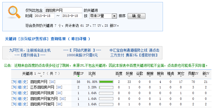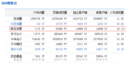 下图为2015年09月18日总访问量。当天共有3135宽带线路,14968台独立电脑访问了泗阳房产61885次。平均每人点击19.74立页面。