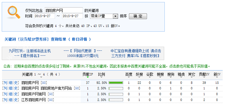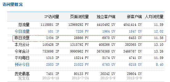 下图为2015年09月27日总访问量。当天共有2496宽带线路,6970台独立电脑访问了泗阳房产28866次。平均每人点击11.56立页面。