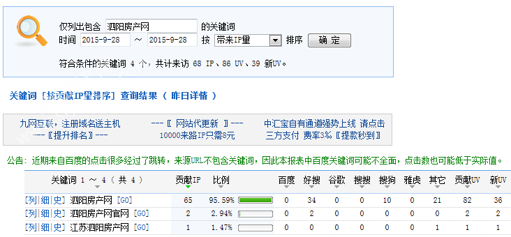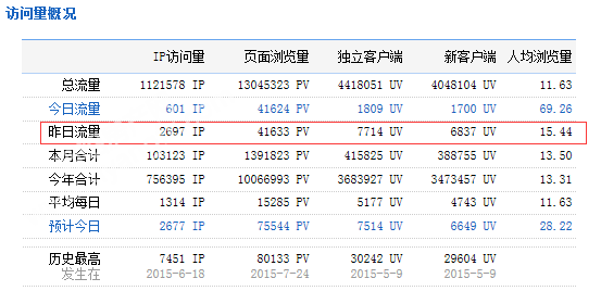 下图为2015年09月28日总访问量。当天共有2697宽带线路,7714台独立电脑访问了泗阳房产41633次。平均每人点击15.44立页面。
