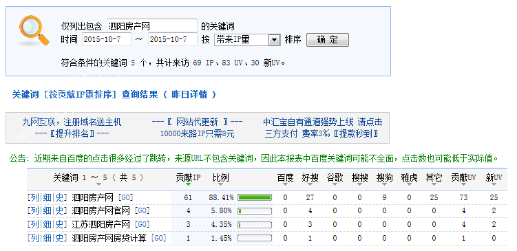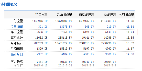 下图为2015年10月07日总访问量。当天共有2638宽带线路,6121台独立电脑访问了泗阳房产37554次。平均每人点击14.24立页面。