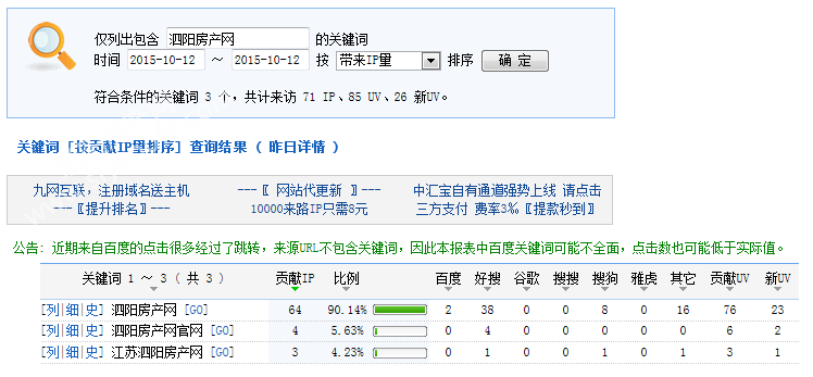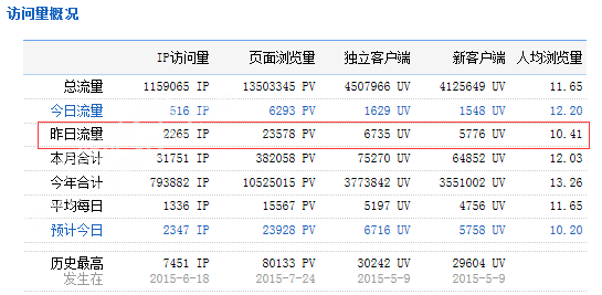 下图为2015年10月12日总访问量。当天共有2265宽带线路,6735台独立电脑访问了泗阳房产23578次。平均每人点击10.41立页面。