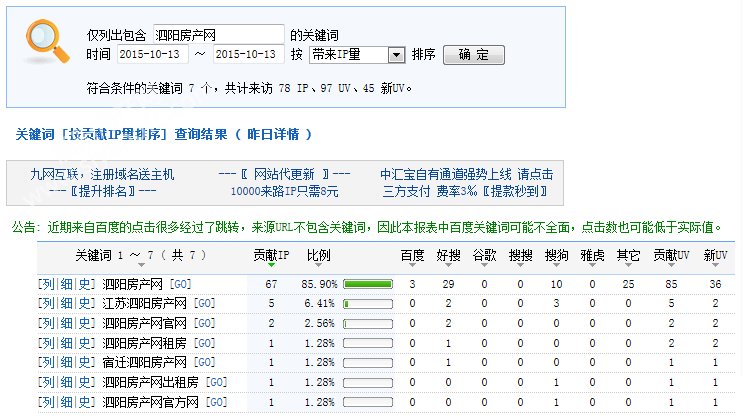 下图为2015年10月13日总访问量。当天共有3523宽带线路,8497台独立电脑访问了泗阳房产28764次。平均每人点击8.16立页面。