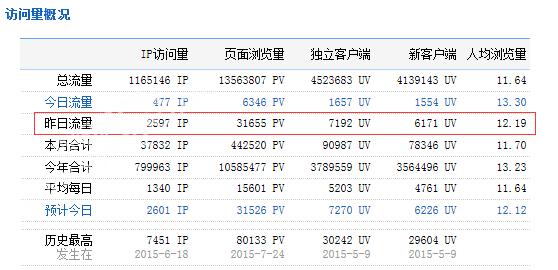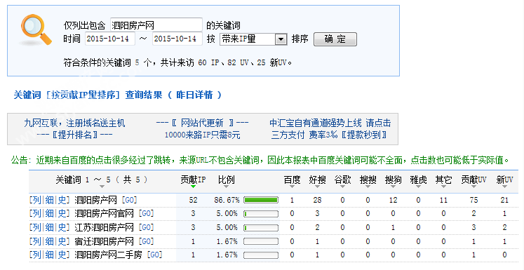 下图为2015年10月14日总访问量。当天共有2597宽带线路,7192台独立电脑访问了泗阳房产31655次。平均每人点击12.19立页面。