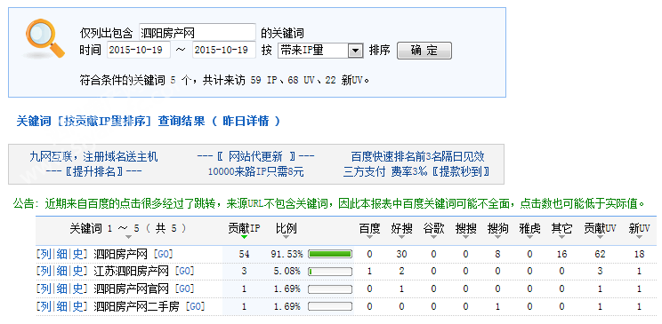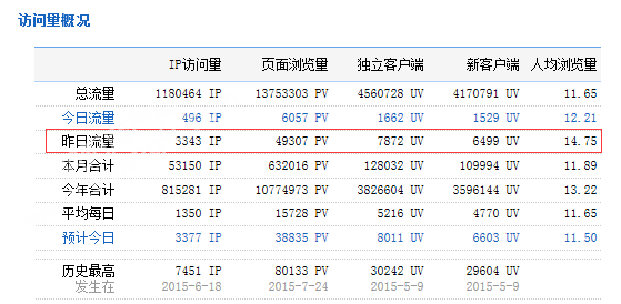 下图为2015年10月19日总访问量。当天共有3343宽带线路,7872台独立电脑访问了泗阳房产49307次。平均每人点击14.75立页面。