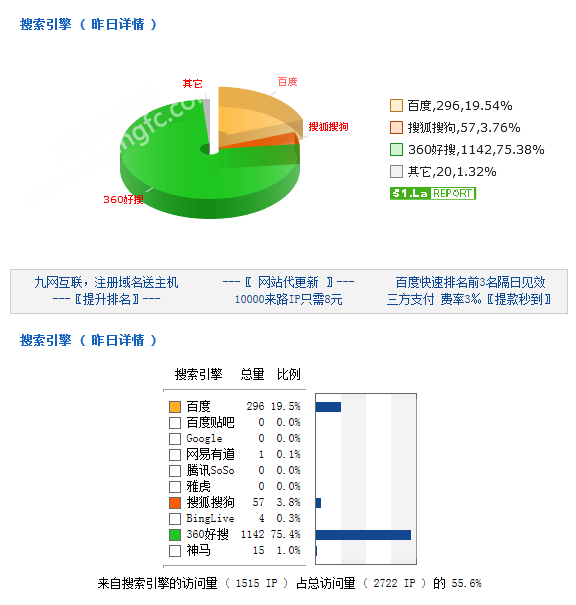 下图为2015年10月22日总访问量。当天共有2722宽带线路,7215台独立电脑访问了泗阳房产41839次。平均每人点击15.37立页面。