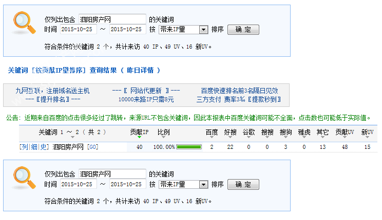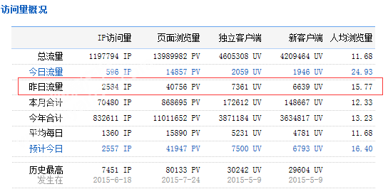 下图为2015年10月25日总访问量。当天共有2584宽带线路,7361台独立电脑访问了泗阳房产40756次。平均每人点击15.77立页面。