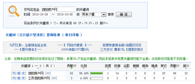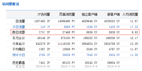 下图为2015年10月28日总访问量。当天共有2767宽带线路,6936台独立电脑访问了泗阳房产27468次。平均每人点击9.93立页面。