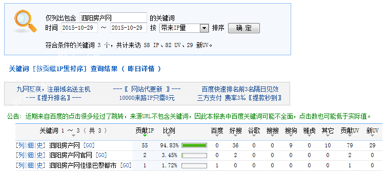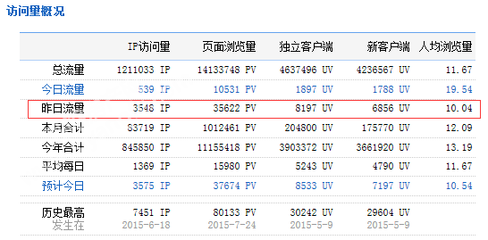 下图为2015年10月29日总访问量。当天共有3548宽带线路,8197台独立电脑访问了泗阳房产35622次。平均每人点击10.04立页面。