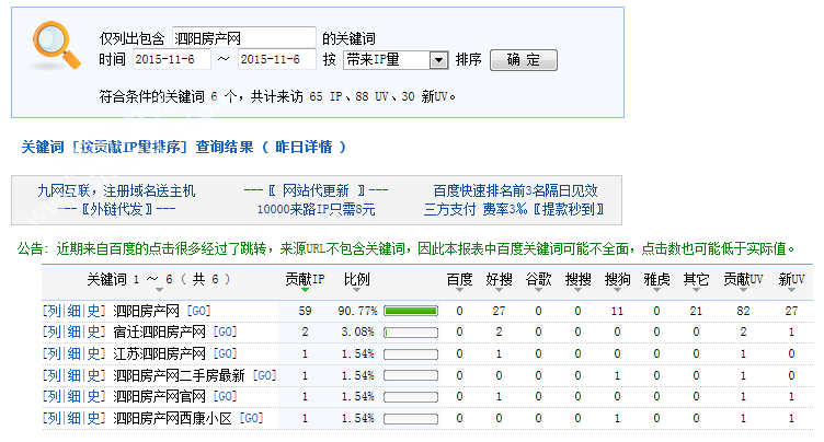 下图为2015年11月06日总访问量。当天共有1418宽带线路,2794台独立电脑访问了泗阳房产15041次。平均每人点击10.61立页面。