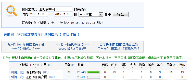 下图为2015年11月08日总访问量。当天共有1542宽带线路,5008台独立电脑访问了泗阳房产17117次。平均每人点击11.10立页面。