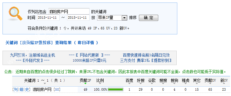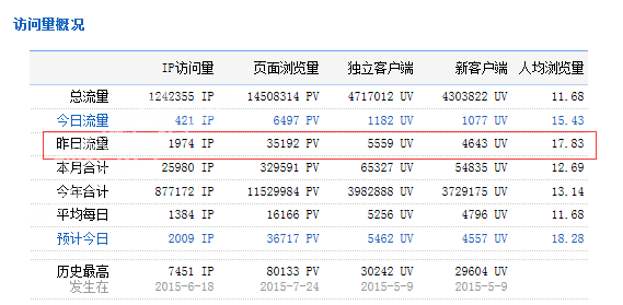 下图为2015年11月11日总访问量。当天共有1974宽带线路,5559台独立电脑访问了泗阳房产35192次。平均每人点击17.83立页面。