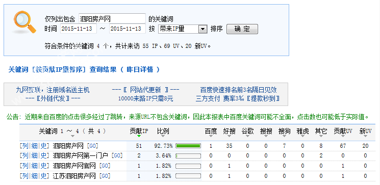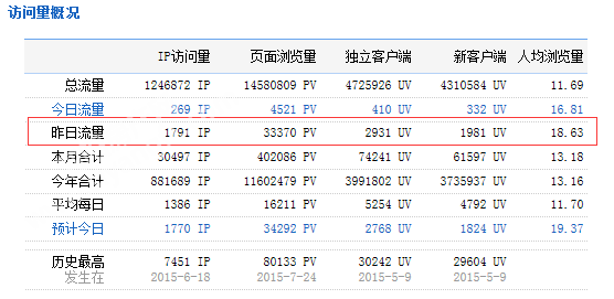 下图为2015年11月13日总访问量。当天共有1791宽带线路,2931台独立电脑访问了泗阳房产33370次。平均每人点击18.63立页面。