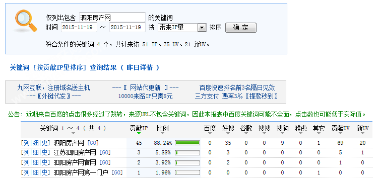下图为2015年11月19日总访问量。当天共有5593宽带线路,9871台独立电脑访问了泗阳房产54572次。平均每人点击9.76立页面。