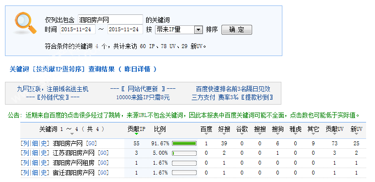 下图为2015年11月24日总访问量。当天共有2852宽带线路,6854台独立电脑访问了泗阳房产36579次。平均每人点击12.83立页面。