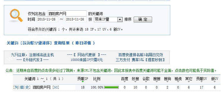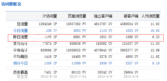 下图为2015年11月26日总访问量。当天共有1106宽带线路,1931台独立电脑访问了泗阳房产6891次。平均每人点击6.23立页面。