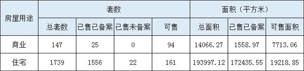 恒天香缇花园的楼盘备案情况为:共有商业房屋总套数是147套,已售已备案有25套,已售未备案的有0套,可售房有94套,总面积有14066.27平方米,已售已备案的有1558.97平方米,可售面积有7713.06平方米;共有住宅房屋总套数是1739套,已售已备案有1556套,已售未备案的有22套,可售房有161套,总面积有193997.12平方米,已售已备案的有172435.55平方米,可售面积有19218.85平方米。